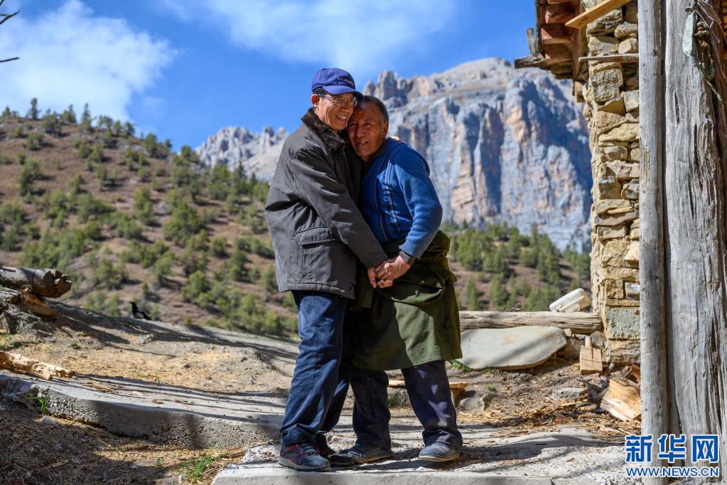 5月3日,李純民前往西藏昌都市類烏齊縣伊日鄉(xiāng)崩日村看望1979年下鄉(xiāng)工作時(shí)結(jié)識(shí)的房東一家。這是房東的大兒子澤仁多加(右)在家門口熱情歡迎他。新華社記者 劉金海 攝