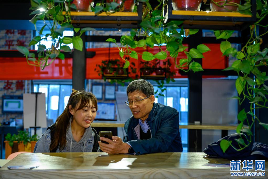 4月22日,在天津大學(xué)一學(xué)生食堂,李純民(右)與“齊興”助學(xué)獎(jiǎng)勵(lì)基金資助的藏族學(xué)生扎西措姆交流。新華社記者 劉金海 攝