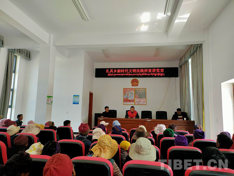 圖為山南扎囊縣扎期鄉(xiāng)新時(shí)代文明實(shí)踐所志愿者宣講黨史 扎囊縣 供圖