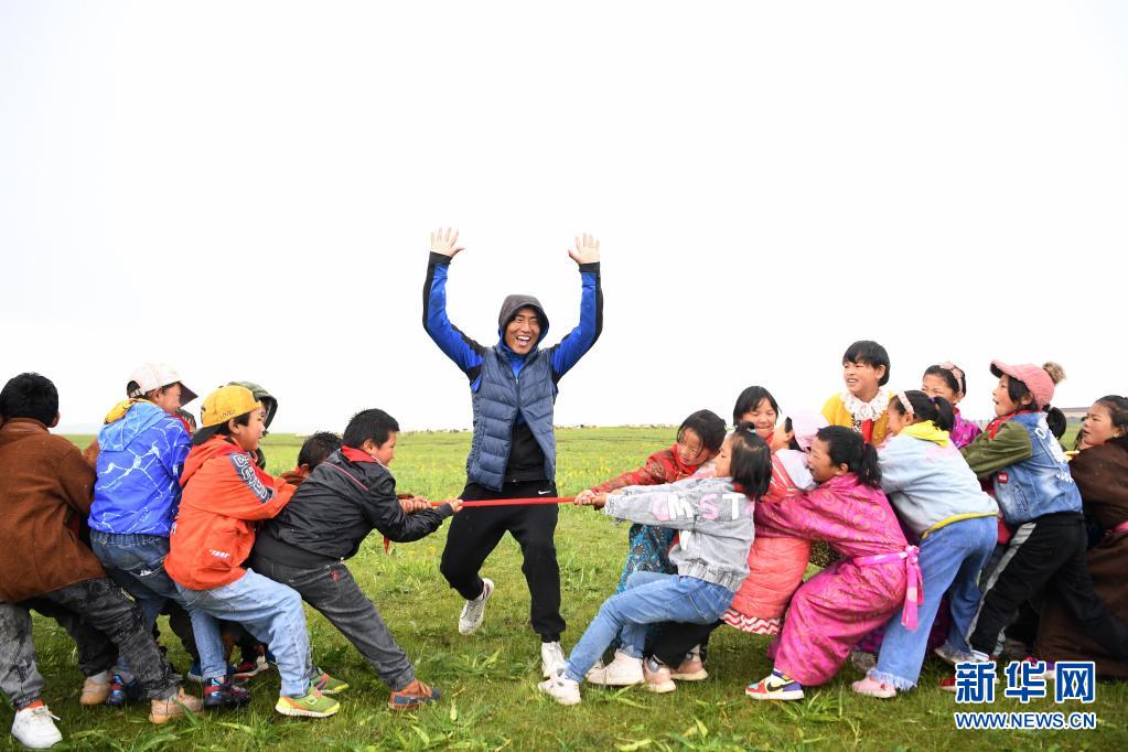 7月14日,河曲馬場小學老師道布旦(中)在草原上組織孩子們拔河。新華社記者 陳斌 攝