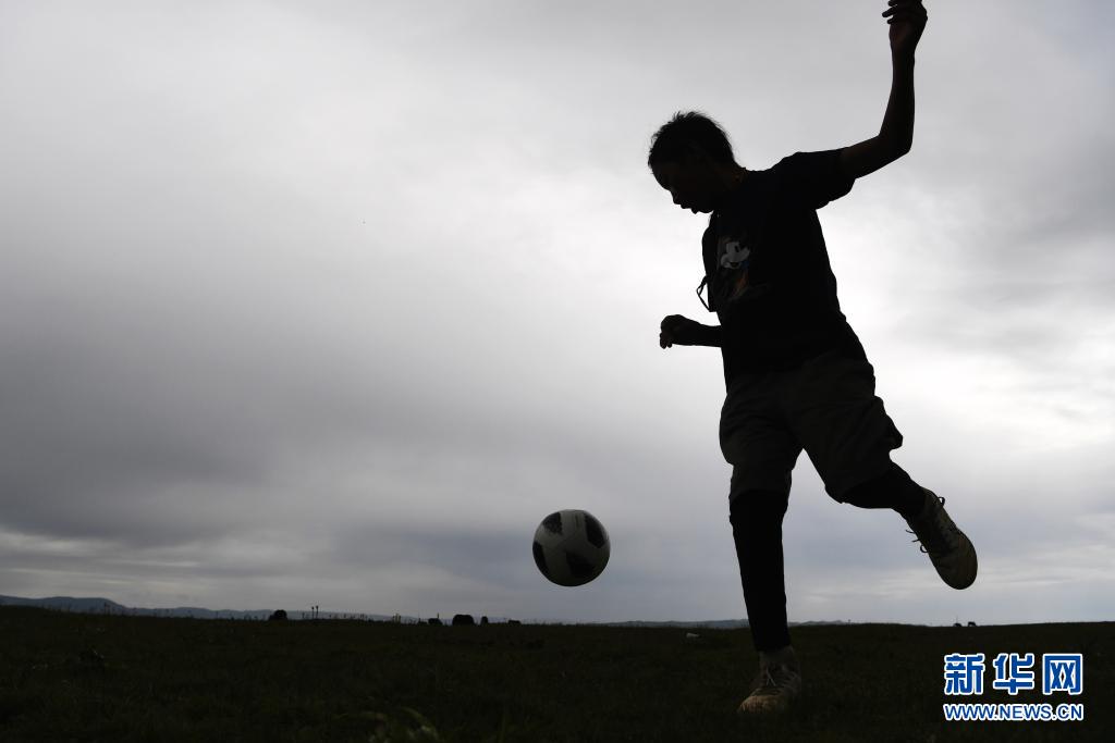 7月14日,河曲馬場小學學生丹增喇巴在草原上踢足球。新華社記者 陳斌 攝