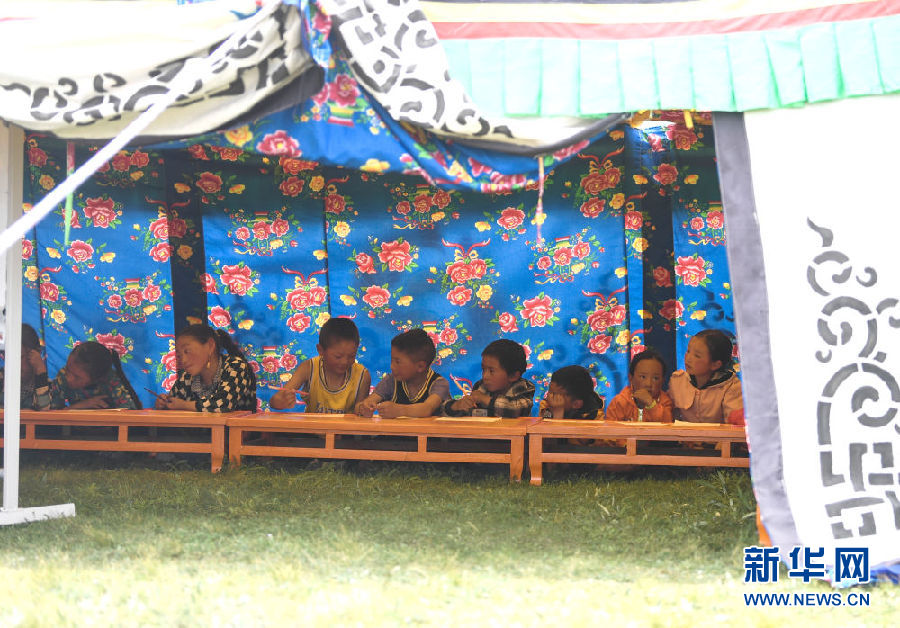8月2日,在青海省果洛藏族自治州瑪沁縣下大武鄉(xiāng)年扎村“育苗加油站”的帳篷里,小朋友們?cè)谶M(jìn)行繪畫(huà)。新華社記者 張龍 攝