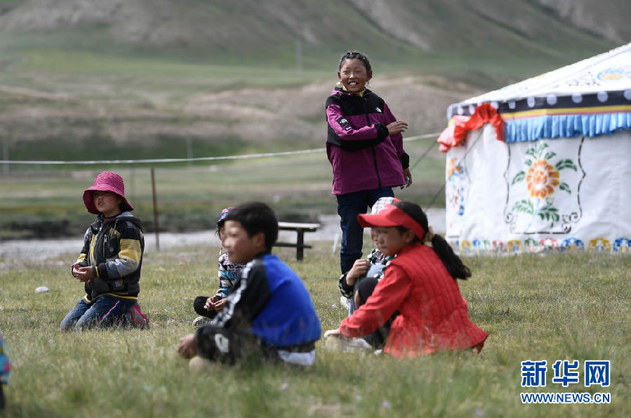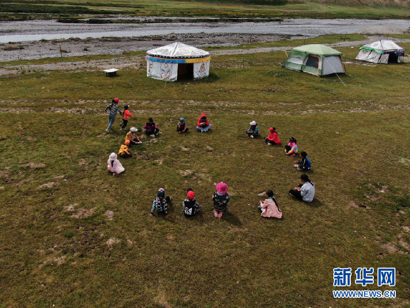 8月2日,在青海省果洛藏族自治州瑪沁縣下大武鄉(xiāng)年扎村的“育苗加油站”,孩子們?cè)谝黄鹜嬗螒?。新華社記者 張龍 攝