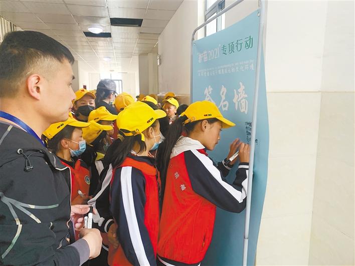 學(xué)生在“護(hù)苗2021”專項行動簽名墻上簽名。記者 張宇 攝