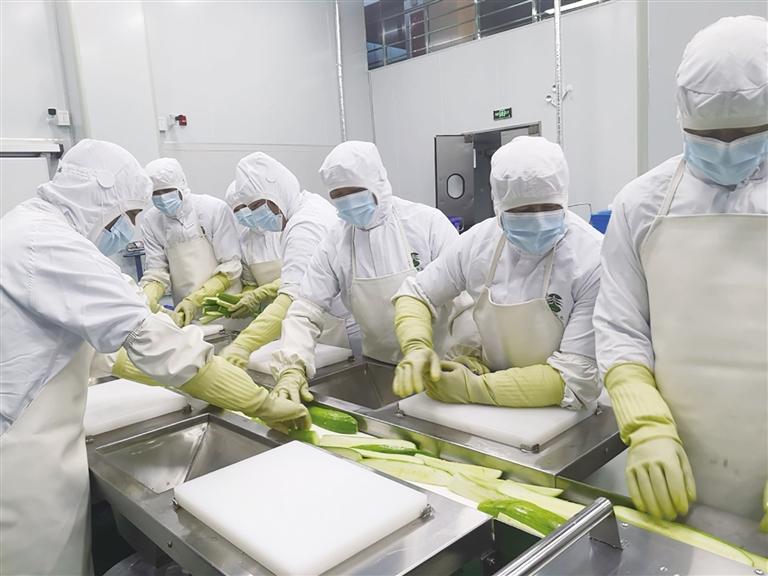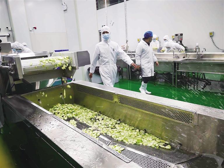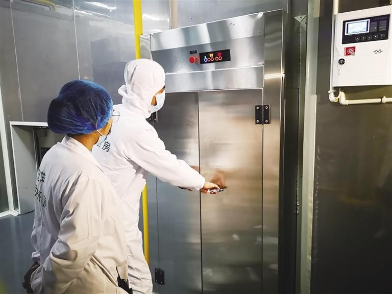 通過員工通道,在該廚房生產(chǎn)廠長甘文忠的指導(dǎo)下,記者穿上了白色工作服、戴上食品安全帽,換上高筒膠鞋,洗手消毒、測量體溫、隨身攜帶的手機、首飾全部摘掉后,通過腳踏池進(jìn)入生產(chǎn)加工車間。