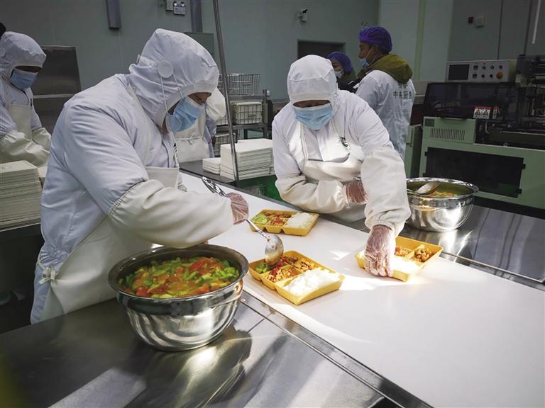 這些凈菜準(zhǔn)備好后,通過設(shè)備轉(zhuǎn)運至熱菜烹炒車間,在這里有幾位廚師正在烹飪宮保雞丁、西紅柿炒蛋、青菜西紅柿湯等。這些凈菜經(jīng)過加工之后被運送至分餐車間。餐盒經(jīng)高溫消毒后,工作人員將每一份米飯、熱菜取樣留存,然后開始分工分餐,打包好的餐盒通過加溫消毒后,裝進(jìn)保溫箱,運送至配餐車內(nèi)。