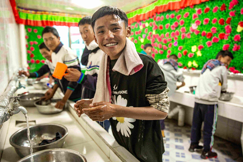 走進薩迦中學新投入使用的女生宿舍樓,可以看到每個房間門口都布置了信息欄,詳細介紹了入住學生信息、室長和帶教老師信息;門口統(tǒng)一配備鞋架,孩子們在門口換好鞋再進房間,保持了室內地面的清潔。室內外隔間是統(tǒng)一的儲物柜,存放學生私人用品;內間是整整齊齊8個上下鋪位,中間合用的臺子上牙刷、水杯整齊劃一擺放;靠窗有統(tǒng)一的臉盆架;每個樓層都有3處盥洗室。由于縣中學內沒有學生浴室,新宿舍盥洗室內還特地安裝了電加熱的恒溫暖水設備。入冬后,薩迦中學的孩子們終于能夠在宿舍洗漱時用上熱水了。