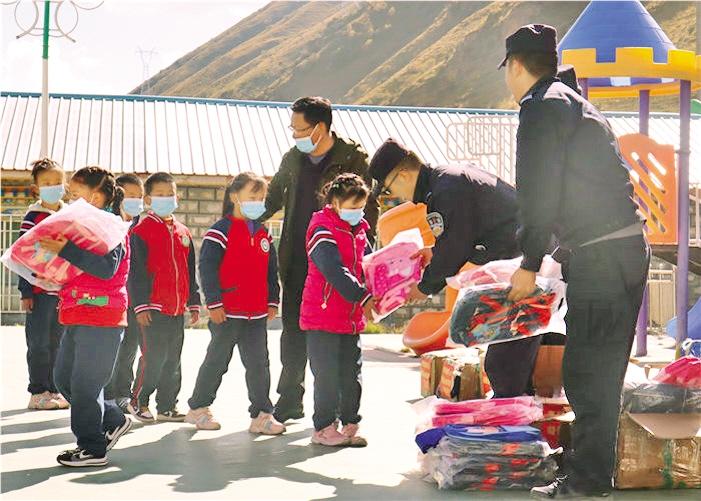 日喀則康布邊境派出所給康布鄉(xiāng)小學學生發(fā)放捐贈物資
