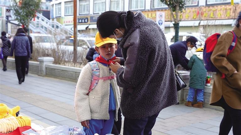 10日早上8時(shí)20分許,小學(xué)生們佩戴鮮艷的紅領(lǐng)巾、頭戴小黃帽,陸陸續(xù)續(xù)走進(jìn)拉薩市第一小學(xué)的校門。今年春季開學(xué)第一天,有些家長(zhǎng)蹲在孩子面前,幫忙整理衣帽,同時(shí)鼓勵(lì)孩子“加油!”。