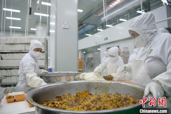 圖為3月11日,西藏自治區(qū)拉薩市城關(guān)區(qū)凈土拉薩中央廚房配餐車間內(nèi),工作人員正在為學(xué)生集中配餐。 中新社記者 貢嘎來松 攝