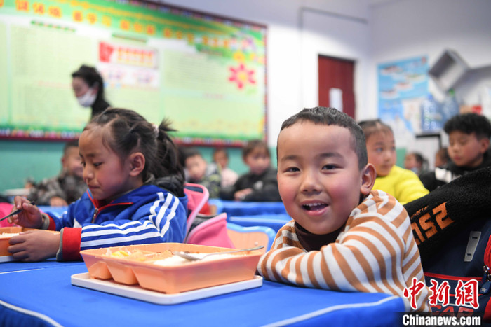 圖為3月11日,西藏自治區(qū)拉薩市城關(guān)區(qū)第三小學(xué)的學(xué)生食用營養(yǎng)午餐。 中新社記者 貢嘎來松 攝
