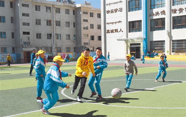 圖為拉薩市第三小學(xué)學(xué)生課間在操場(chǎng)上踢足球。記者 洛桑 攝