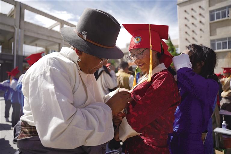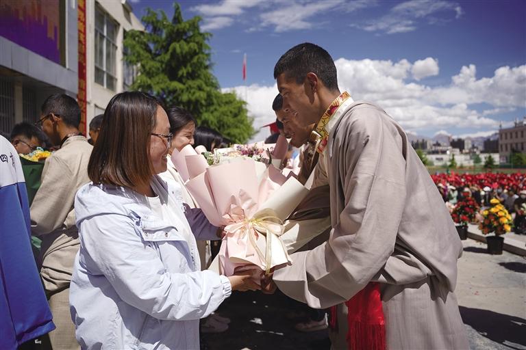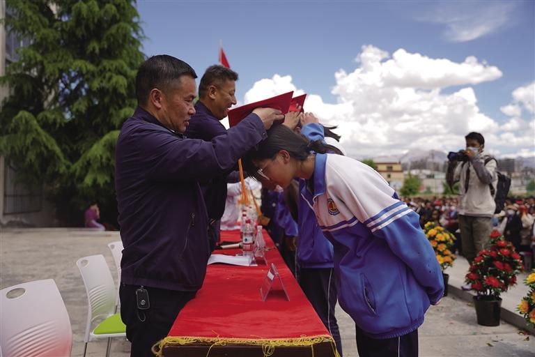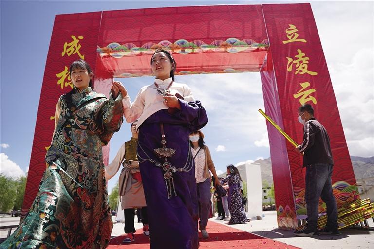 走進(jìn)拉薩市第四高級(jí)中學(xué),校園里每個(gè)角落都流露出喜悅與溫馨,同學(xué)們身著色彩鮮艷的民族傳統(tǒng)服裝,帶著自信的笑容,在父母與老師的陪伴下,走過“成人門”,踏上“成才路”,通向“成功門”。此時(shí)的他們意氣風(fēng)發(fā),青春的面龐如同朝陽一般閃爍著光芒,滿懷豪情地憧憬精彩的人生。高三學(xué)生朗色占堆告訴記者:“今天是特別值得紀(jì)念的日子,以后我們都是成年人了,會(huì)勇于承擔(dān)責(zé)任,對(duì)自己的行為負(fù)責(zé),努力成為一個(gè)有知識(shí)、知感恩、有責(zé)任、有擔(dān)當(dāng)?shù)男聲r(shí)代新青年?!?/p>