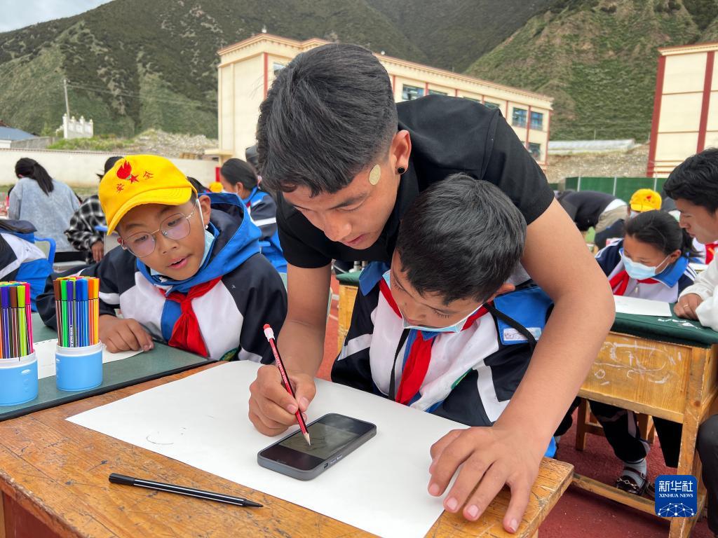 西藏大學(xué)美術(shù)專(zhuān)業(yè)學(xué)生為工布江達(dá)縣小學(xué)孩子們輔導(dǎo)繪畫(huà)。(受訪者供圖)