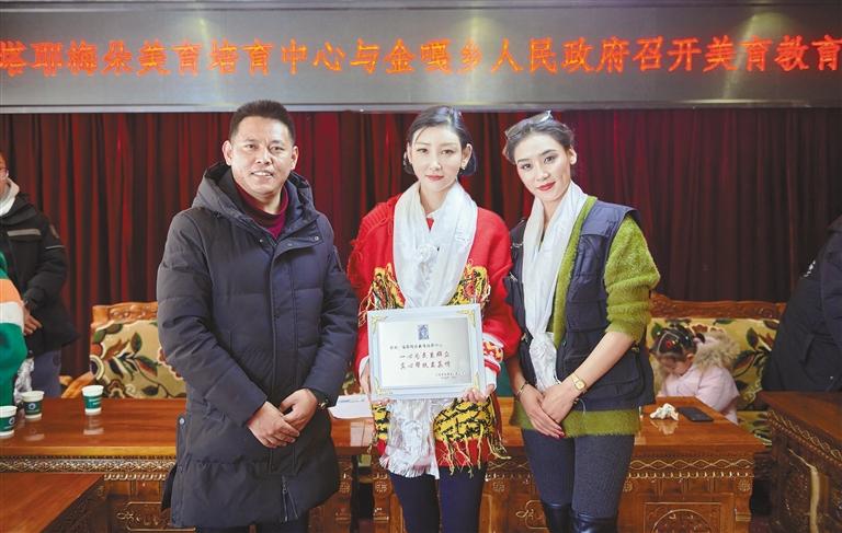 洛桑卓瑪(中)帶領(lǐng)團(tuán)隊(duì)前往日喀則市江孜縣金嘎鄉(xiāng)開展美育公益活動。