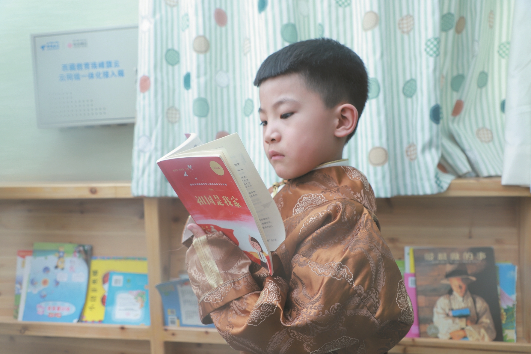 圖書(shū)館里,來(lái)自拉薩市江蘇實(shí)驗(yàn)幼兒園大五班的小朋友益西加措仔細(xì)地挑選著自己喜歡的書(shū)籍,只見(jiàn)他饒有興致地選中這本《祖國(guó)是我家》,并發(fā)現(xiàn)了書(shū)中“我在南京,我為中華之崛起而讀書(shū)”的卡片時(shí),他回應(yīng)道:“我在西藏,我為中華之崛起而讀書(shū)。”