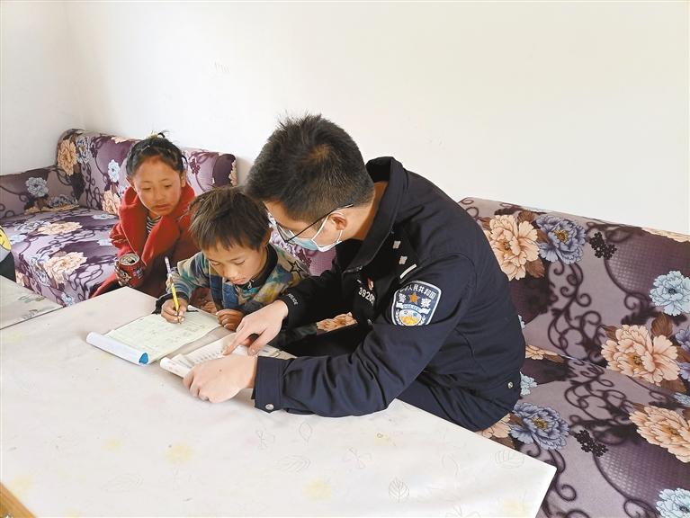 “老師,小扎西最近在學(xué)校表現(xiàn)的怎么樣?”扎西江措在上察隅鎮(zhèn)小學(xué)上一年級,這個年齡段的孩子,最是調(diào)皮的時候,每當(dāng)派出所民警下鄉(xiāng)走訪經(jīng)過學(xué)校時,都會找到小扎西的班主任詢問最近狀況。孩子們?nèi)粘W(xué)習(xí)、生活中的一舉一動,不僅牽動著派出所民警的心,也牽動著遠(yuǎn)在千里之外駐村民警化旦的心。“柯琪,孩子們最近還好嗎?我看物流信息顯示圖書和零食已經(jīng)到了,你們下鄉(xiāng)的時候就把東西帶過去……”2020年,化旦分配到上察隅邊境派出所,喜歡孩子的他,迅速和扎西、拉姆打成一片,平時只要有空便帶著學(xué)習(xí)、生活用品去看他們,為了迎合孩子們的興趣愛好,化旦也會從網(wǎng)上學(xué)習(xí)兒童歌曲、舞蹈,與孩子們一起唱歌跳舞。