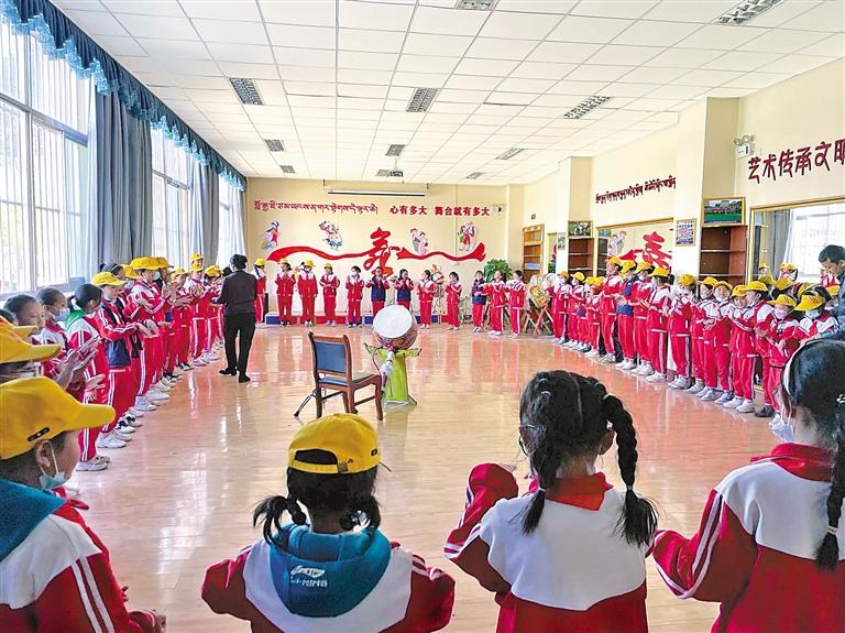 自2019年開始,娘熱小學大力開展“非遺進校園”活動,充分利用娘熱民間藝術團的良好資源,相繼把國家級非物質(zhì)文化遺產(chǎn)代表作藏戲、朗瑪、卡爾魯?shù)幕緞幼骶幣懦蓪W校特色教育,在全校各班級進行推廣。