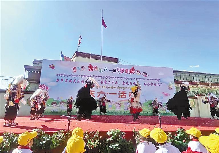 圖為藏戲興趣班的學生在慶“六一”活動中表演藏戲。