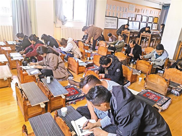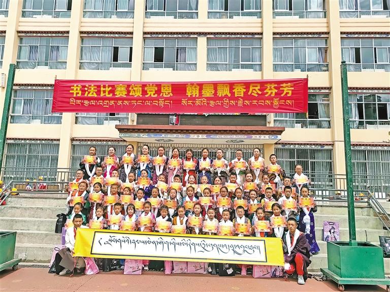 “我們學校組織過幾次書法比賽,還選取了一些較好的作品裝訂成書,發(fā)放到每個班級供學生們參考。這樣一來,很多學生在書上看到別人的照片和書法作品時,能夠激發(fā)他們對書法的興趣和書寫的積極性?,F(xiàn)在,參賽的學生越來越多了。”娘熱小學副校長拉巴介紹,在教育改革以及學?!半p減”工作和課后服務的背景下,娘熱小學積極探索,結(jié)合本校實際情況,開設了藏戲、藏文書法、校園足球等三大特色板塊。2019年,拉薩市文聯(lián)、曲藝家協(xié)會以及書法家協(xié)會分別授予娘熱小學曲藝、舞蹈、藝術教育培訓基地和書法教育培訓基地稱號,極大提高了師生的學習積極性。