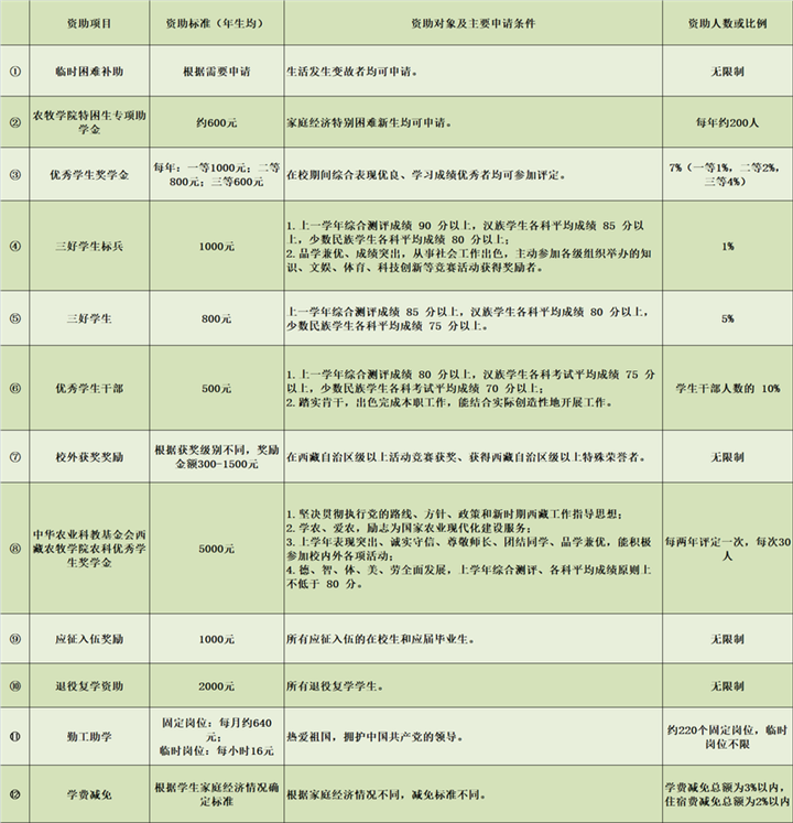 這些資助項目包括國家政策、西藏自治區(qū)政策和西藏各高校的政策,全部列出了明確的申請條件,涵蓋了學生生活、學習的方方面面。其中,有的項目針對家庭經(jīng)濟困難的學生給予學費、住宿費等的減免;有的項目為學生提供各種校內(nèi)勤工助學機會,讓學生通過勞動獲得報酬;有的項目獎勵入伍,有的項目獎勵發(fā)明創(chuàng)造……并且,西藏各高校在制定資助政策時體現(xiàn)出了各學校鮮明的辦學特點。例如,西藏藏醫(yī)藥大學設(shè)置了面向所有學生的“記誦《三部醫(yī)典》獎”,要求“熱愛社會主義祖國,擁護中國共產(chǎn)黨的領(lǐng)導(dǎo);遵紀守法,遵守學校規(guī)章制度;背誦學生按‘三部醫(yī)典’章節(jié)順序依次背誦。在背誦過程中,要吐字清晰,聲音宏亮,總時間不能超過2個小時?!狈彩沁_到要求的學生,獎勵1800元。