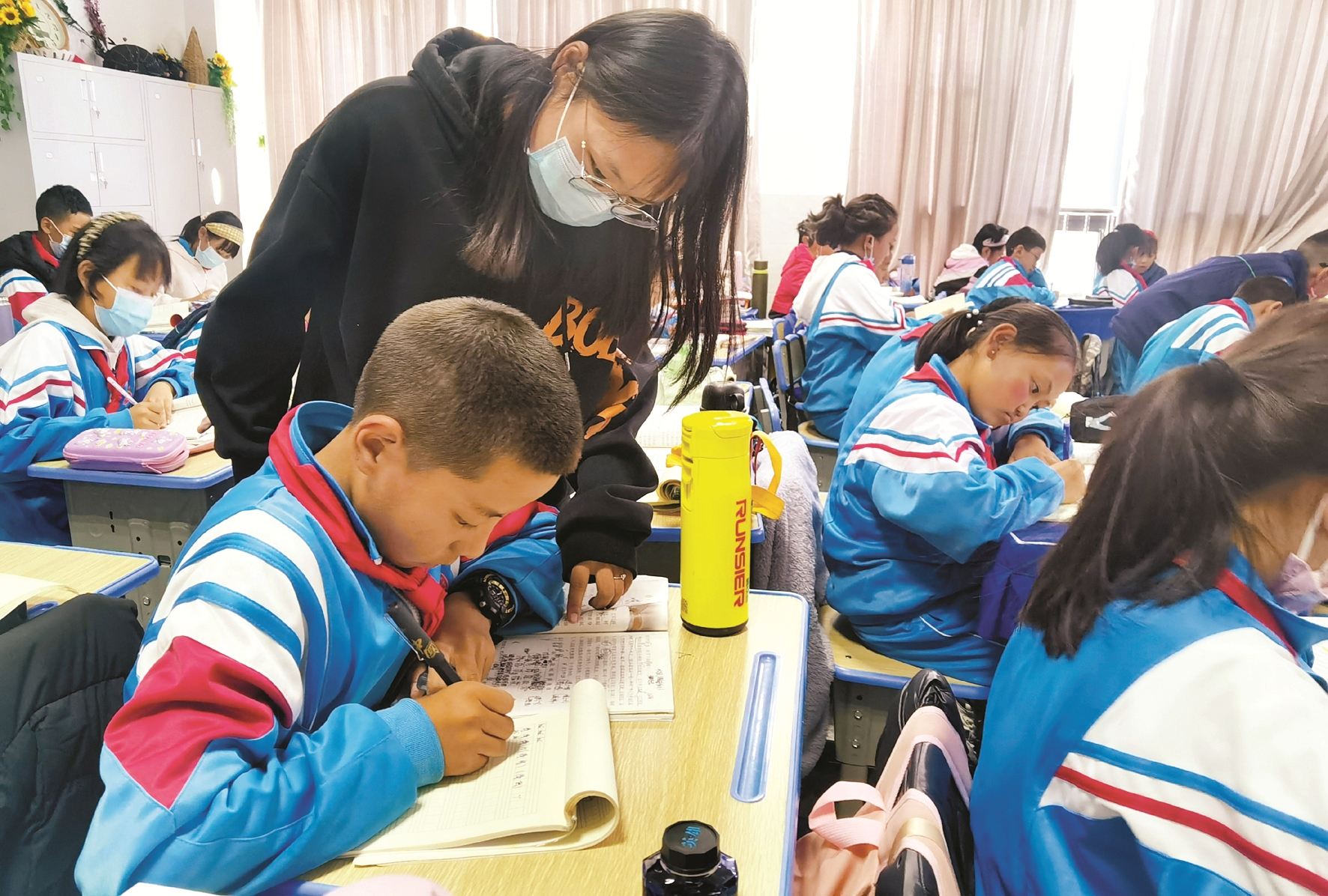 圖為拉薩市第一小學(xué)教育城分校老師為孩子講解題目。(資料圖片) 拉薩融媒記者 范江英攝