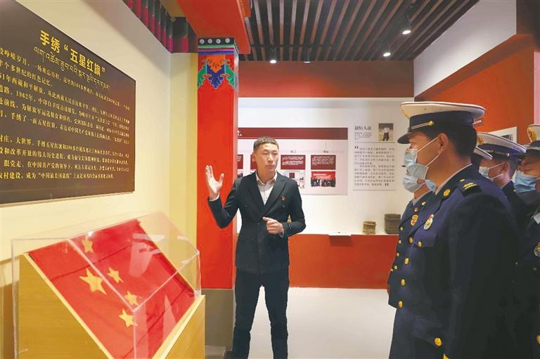 圖為消防救援人員聆聽(tīng)基地工作人員講解展品——手繡“五星紅旗”的故事。記者 桑鄧旺姆 通訊員 姚響 張洪 攝
