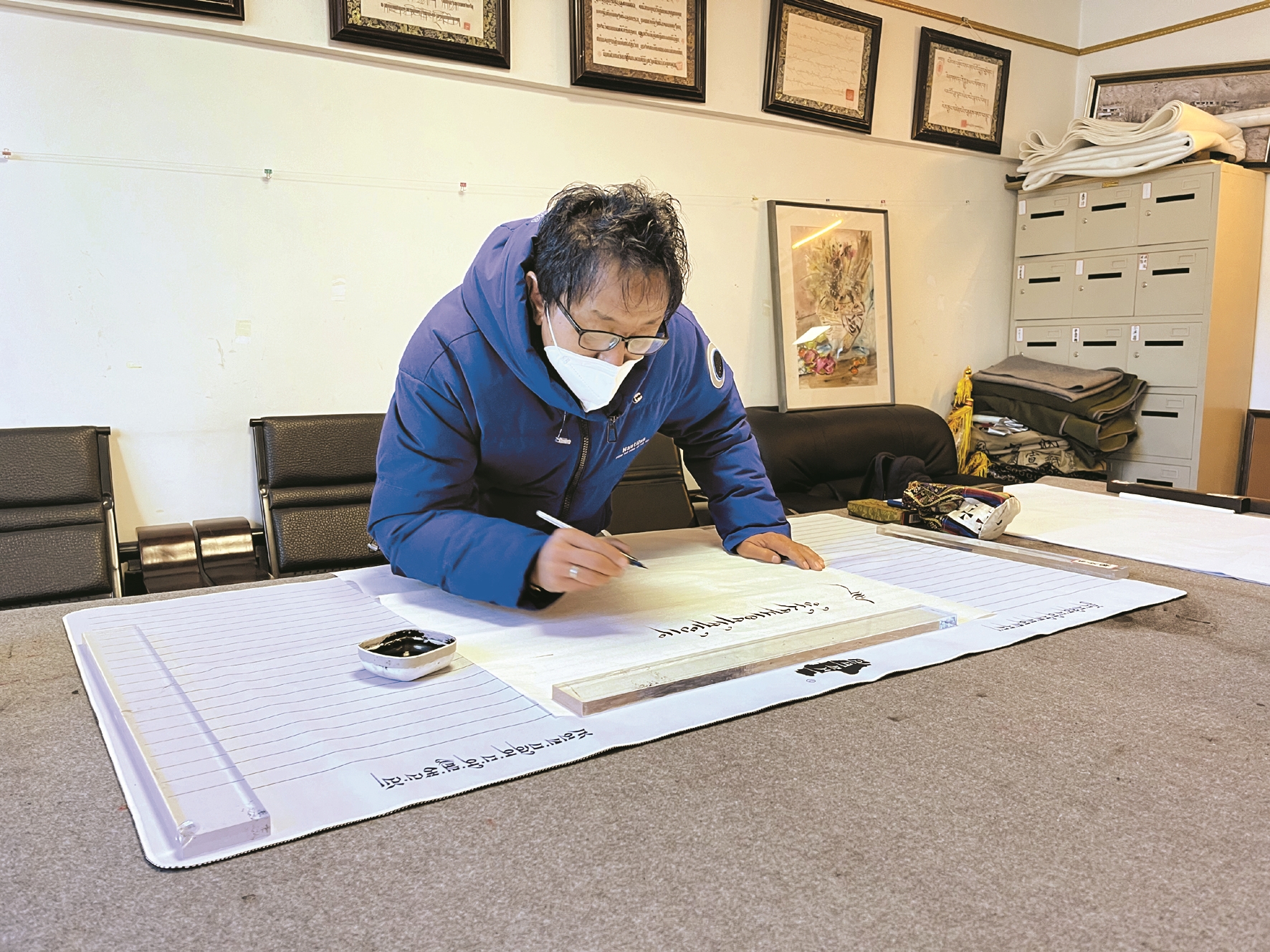 “熱烈慶祝黨的二十大勝利召開”“不忘初心 牢記使命”“人民就是江山 江山就是人民”……走進(jìn)市文聯(lián),映入眼簾的是一幅幅藏文書法作品,書法家匠心獨(dú)運(yùn)、潑墨揮毫,以黨的二十大報(bào)告中的引典金句為主要內(nèi)容,行筆于珠擦、白粗、丘三種字體之間。40幅作品情凝筆端,內(nèi)涵豐富,或渾厚勁健,或靈動飄逸,生動展現(xiàn)黨的光輝歷程。每幅藏文書法作品下方都附有對應(yīng)的漢語原文,讓參觀者能對黨的二十大報(bào)告原原本本學(xué)、逐字逐句學(xué)、深入系統(tǒng)學(xué)、融會貫通學(xué)。
