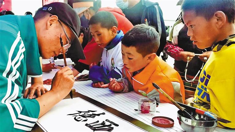圖為阿里地區(qū)書畫家進社區(qū)活動現(xiàn)場,為群眾書寫扎西德勒。通訊員 唐磊 攝