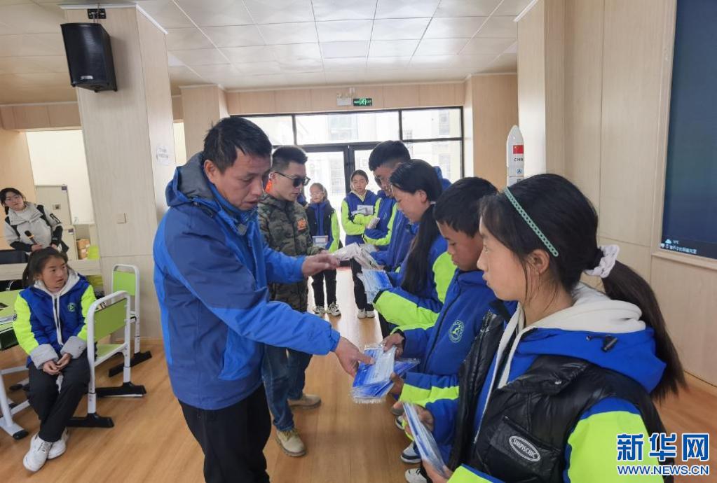 福建省第十批援藏工作隊教育組教師代表正在為學(xué)生們發(fā)放書籍和口罩。