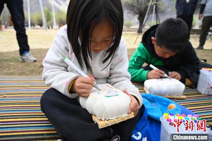 圖為兒童體驗(yàn)羊皮筏彩繪?!≮w朗 攝