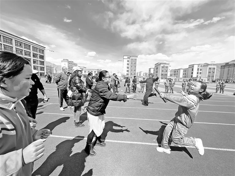 圖為學生及家長參加接力比賽。記者央金 攝
