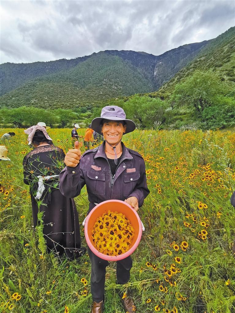 圖為巴宜區(qū)人社局聯(lián)合林芝林卡旅游開發(fā)有限公司開展“以工代訓(xùn)”,組織農(nóng)牧民群眾在布久鄉(xiāng)工布原鄉(xiāng)景區(qū)采收雪菊。通訊員 楊健 記者 謝筱純 王珊 攝