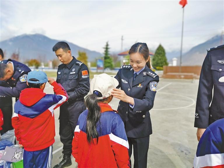 圖為羌納邊境派出所民警為結對幫扶的同學發(fā)放學習生活用品。記者 張猛 王珊 謝筱純 攝