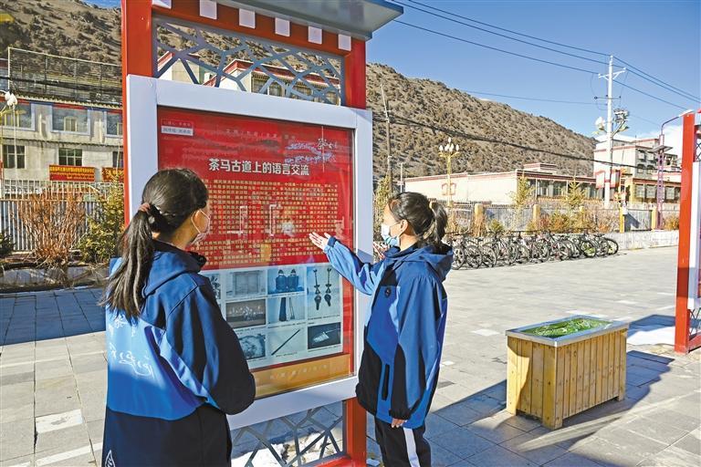 那曲市嘉黎縣中學(xué)民族團(tuán)結(jié)長(zhǎng)廊解說員(右)向同學(xué)講解茶馬古道上的民族團(tuán)結(jié)故事。記者 薛瑩 益西加措 攝