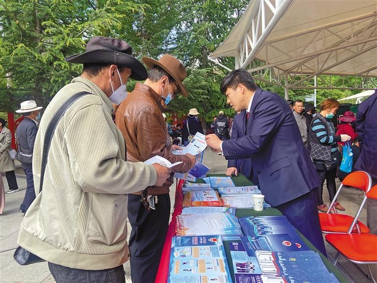 清晨的宗角祿康公園人來人往,人們或圍坐在一起等待節(jié)目開始,或流連于每個宣傳展臺前,聽工作人員講解法律知識,廣場中央的電子顯示屏上正播放著《民法典》的宣傳片。
