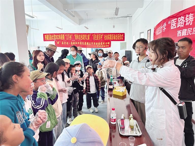 出征儀式上,大學(xué)生理論宣講團(tuán)成員以黨的二十大報(bào)告為切入點(diǎn),結(jié)合在成長過程中所學(xué)、所見、所聞,向社區(qū)干部和居民宣講。東南大學(xué)副教授廖望為居民宣講合理膳食醫(yī)學(xué)知識。中山大學(xué)醫(yī)學(xué)院教授楊中漢用通俗易懂的語言,詳細(xì)講述了急救技能、自救措施,并用假人模型進(jìn)行現(xiàn)場展示,贏得了大家的陣陣掌聲。文藝宣傳隊(duì)成員為社區(qū)居民帶去了豐富多彩的文藝演出,演出以歌舞為主,傳統(tǒng)鍋莊、熱巴舞、芒康弦子舞、新疆舞、街舞等舞蹈精彩紛呈,歌曲以獨(dú)唱合唱形式,圍繞禮贊中國共產(chǎn)黨,禮贊新時代、新西藏等主題,豐富了社區(qū)群眾的精神文化生活。