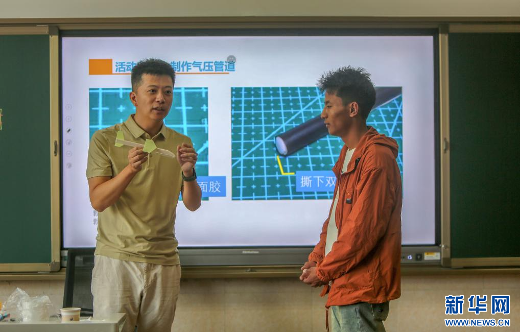 在《航空模型制作》課上,北京市少年宮科技教學(xué)部教師張文龍(左)正在與拉薩本地教師進行互動(8月23日攝)。新華社記者 邵澤東 攝