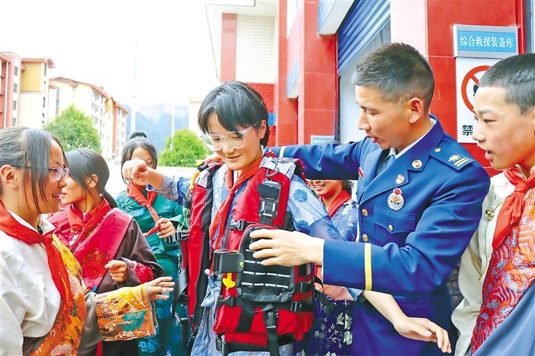 學(xué)生體驗(yàn)水域救援裝備。記者 胡文 通訊員 西繞拉翁 袁勇彬 攝