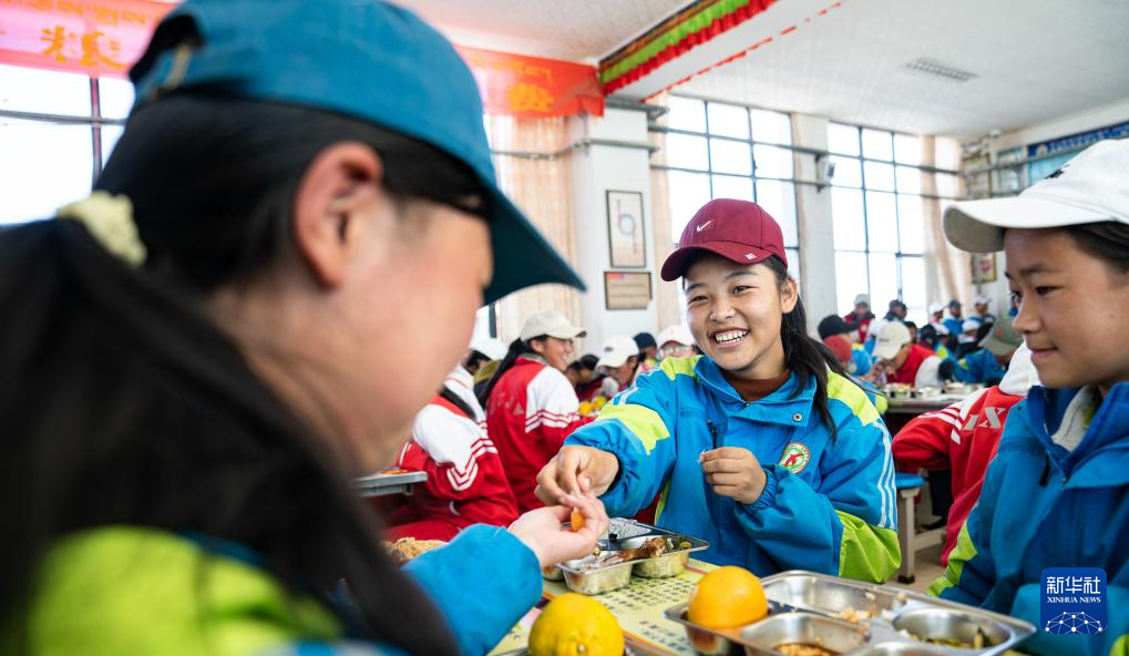 斯曲卓瑪(中)在學校吃午餐(11月10日攝)。新華社發(fā)(丁增尼達 攝)