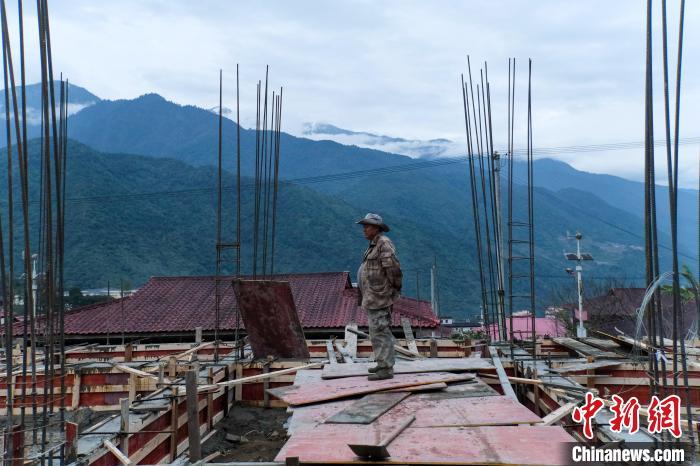 12月18日傍晚,墨脫縣門巴族村民新生在新建房屋地基上查看進度?!≈行律缬浾?江飛波 攝