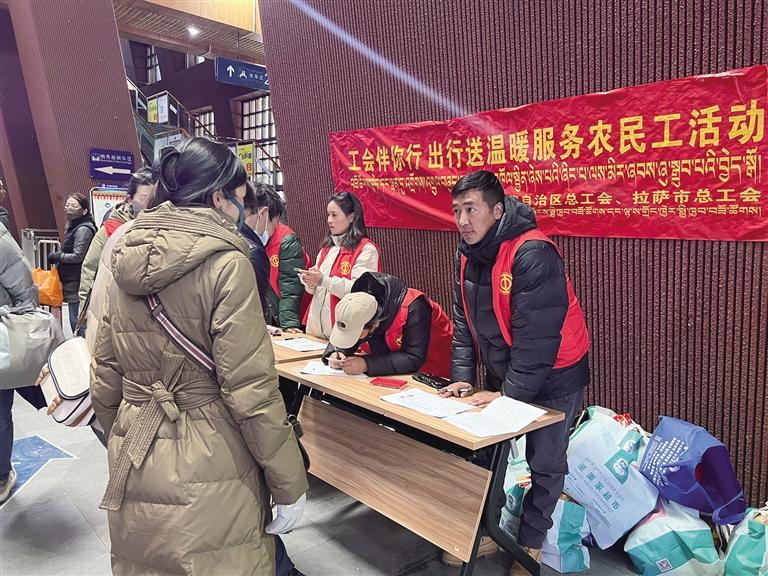 1月31日,西藏自治區(qū)總工會(huì)與拉薩市總工會(huì)聯(lián)合柳梧新區(qū)公安局應(yīng)急處突大隊(duì)、中國青藏鐵路集團(tuán)有限公司,在拉薩火車站內(nèi)為返鄉(xiāng)農(nóng)民工發(fā)放1000份“工會(huì)愛心大禮包”,并提供乘車咨詢、便民服務(wù)、維持秩序等服務(wù),將工會(huì)組織的溫暖送到農(nóng)民工心坎上。