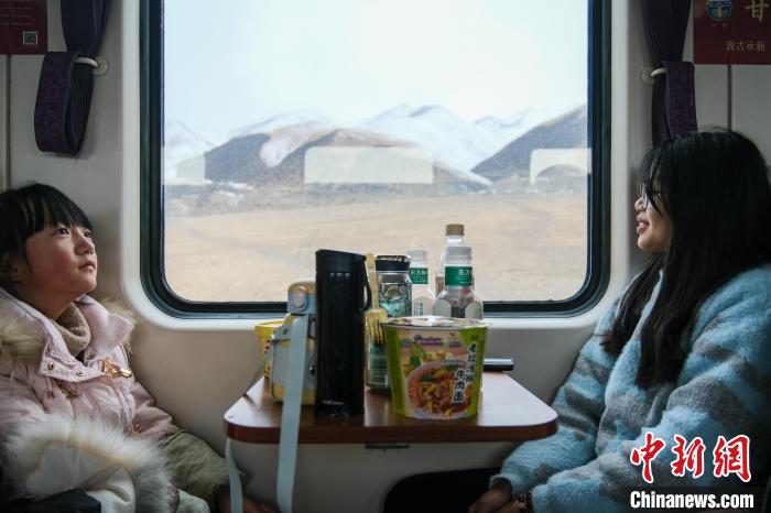 2月1日,Z166次列車上,來自廣東廣州的大學(xué)生周子茹(右)欣賞青藏鐵路沿線高原風(fēng)光。 中新社記者 江飛波 攝