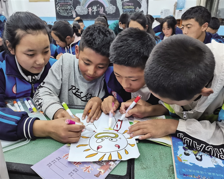 “通過(guò)拉巴卓瑪?shù)倪@幅畫(huà),我了解到她是一個(gè)很有想法的孩子,她很清楚自己想要什么。課程剛開(kāi)始時(shí),我觀察到她一個(gè)人坐在角落里,低著頭,也不怎么和旁邊同學(xué)說(shuō)話,但是通過(guò)這個(gè)課程的開(kāi)展,她會(huì)在課后主動(dòng)跑來(lái)和我說(shuō)她近期遇到的困惑,我感覺(jué)到她正逐漸敞開(kāi)心扉,這與我們當(dāng)初開(kāi)設(shè)這個(gè)課程的初心是一樣的。我們就是希望可以通過(guò)這些課程,讓當(dāng)?shù)氐膶W(xué)生在心理方面得到更多的開(kāi)導(dǎo)、正視自己的情緒,并從中去獲得一些能量,所以現(xiàn)在看到她的變化,我很高興。”王婕婷說(shuō)。