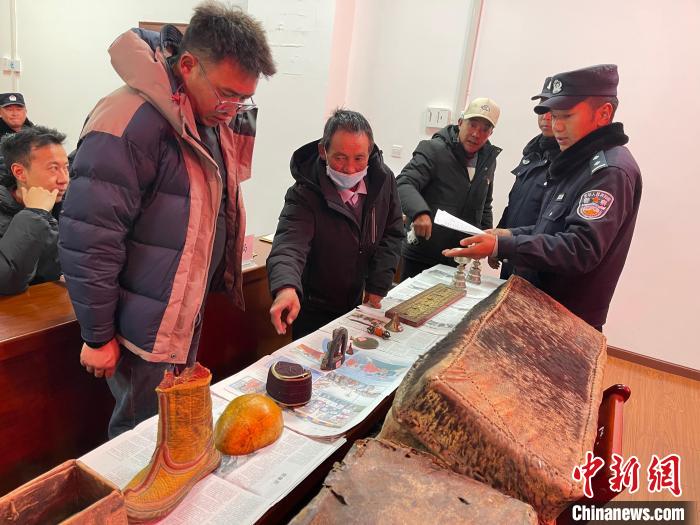 圖為2024年2月22日,錯那警方將追回的文物返還給寺廟。(錯那市公安局 供圖)