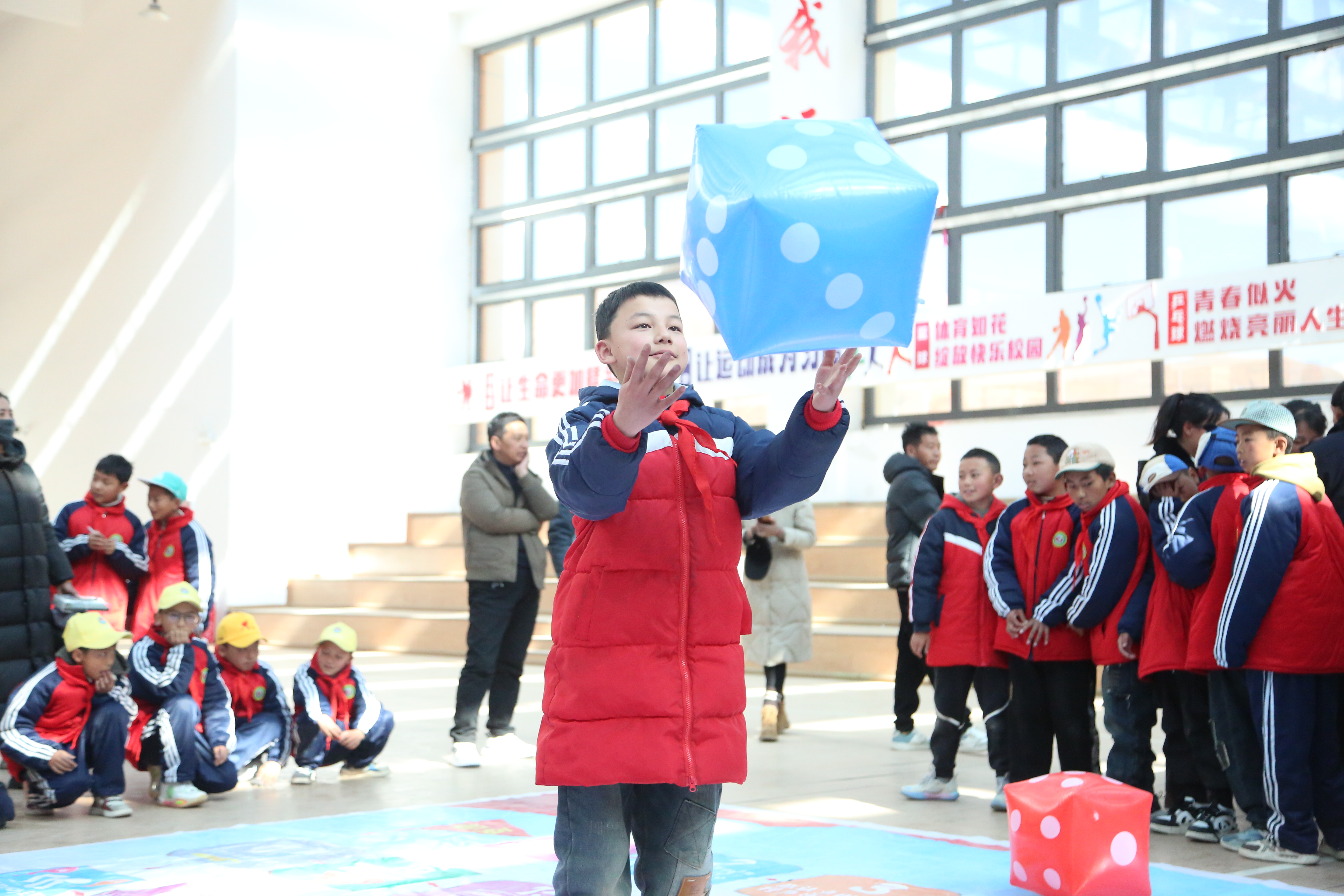 活動現(xiàn)場引入比賽機制,100多名學生歡聚在操場上玩起占地6米乘6米的超大棋盤。擲骰子、跳格、快速回答法律問題、完成相應任務、領取獎勵......場上歡聲不斷,場外躍躍欲試?!斑@個‘法治飛行棋’真好玩,玩游戲的同時還能學習法律知識,比坐在教室里聽講好多了,還獲得了好多小禮品?!蔽迥昙?班的珠薩同學高興地告訴記者。