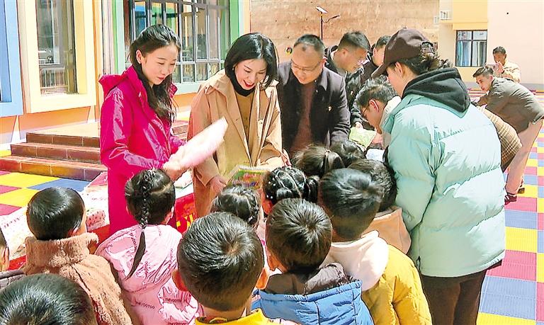 圖為天津援藏貢覺(jué)工作隊(duì)隊(duì)員為幼兒園兒童發(fā)放書(shū)籍。西熱旦青 記者 平措郎加 攝