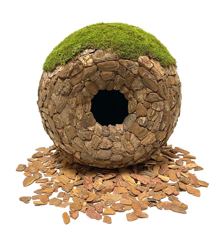 嘎瑪次仁的作品聚焦生態(tài)環(huán)境,作品《意象·自然》,是對(duì)“自然”理解的一種概念性的抽象表達(dá)。其形式上為一個(gè)中空球形裝置,表面為拼貼的樹(shù)皮,頂部種植有苔蘚。正面的部分區(qū)域內(nèi)陷,中間為一孔洞,為了更凸顯出洞中的“黑暗”與“未知”,內(nèi)部涂有特殊啞光涂料。為了體現(xiàn)出“生命感”,他在作品內(nèi)部安裝了感應(yīng)發(fā)聲裝置,感知到人靠近后會(huì)發(fā)出輕微的心跳聲。