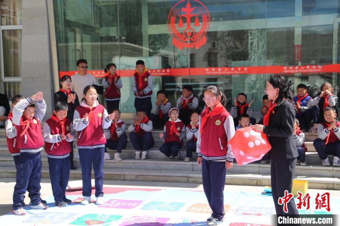 圖為學(xué)生們正在和法院干警一起參加超大棋盤游戲。倫珠澤仁攝