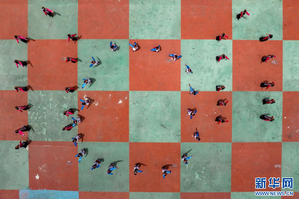 6月21日,乃東區(qū)亞堆鄉(xiāng)小學(xué)的學(xué)生在表演節(jié)目(無人機(jī)照片)。新華網(wǎng) 旦增努布 攝
